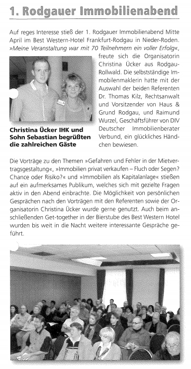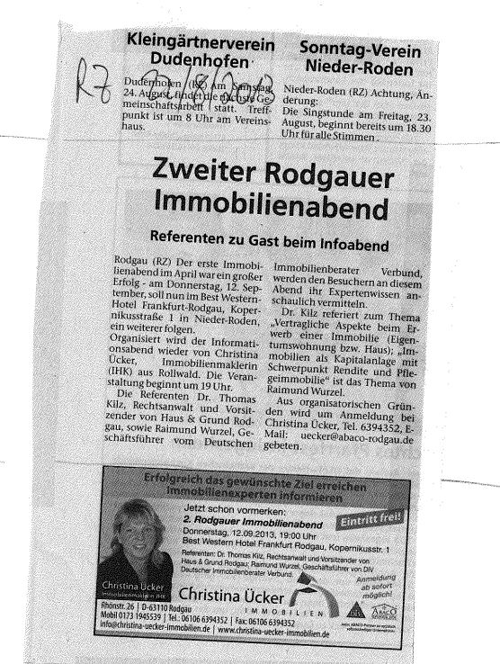 In der Presse Hier finden Sie eine Auswahl an Presseberichten der letzten Jahre. Zweiter Rodgauer Immobilienabend – August 2013Stadtpost Rodgau – April 2014Mein Rodgau Nr 5 – 2013Rodgau Post – November 2008Offenbach Post – November 2008Rodgau Zeitung – November 2008Rodgau Post -September 2008Rodgau Post – Mai 2008Offenbach Post – Februar 2008Rodgau Post – Oktober 2007Rodgau Post – Februar 2005